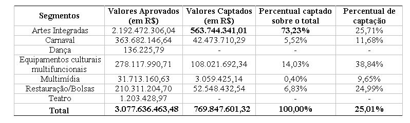 Por segmento, destacaram-se as áreas de Teatro e Dança, que juntos somam mais de 88% do recurso captado. Considerando-se o caráter mercadológico da LIC, o destaque de Teatro e Dança pode ser explicado por serem segmentos que possuem potencial de proporcionar à iniciativa privada maior visualização perante o público, levando consequentemente a conquista de novos consumidores e maior lucro para os patrocinadores (Mega, 2015).