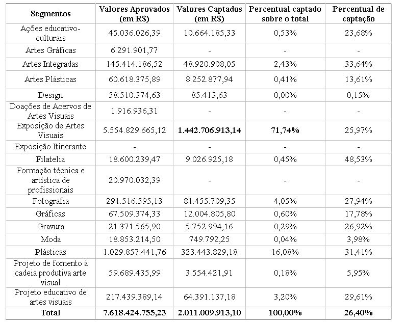 O segmento de Exposição de Artes Visuais concentra a maior parte dos recursos captados. Explica-se que este segmento é crescente no Brasil em termos de apreensão de público e exigência de qualidade, existindo muitos profissionais especializados para projetar exposições nesse nicho (Razuk, 2011).