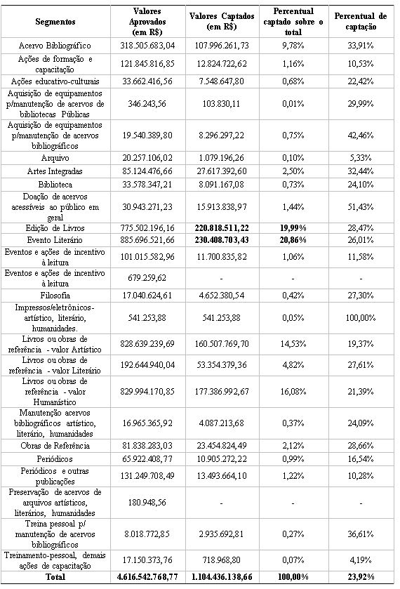 Eventos Literários e Edição de Livros destacam-se como segmentos que possuem maior participação no volume captado. Por ser uma área caracterizada pelo ensejo a literatura, os dois segmentos destacados representam formas de criação e divulgação de produtos culturais literários.