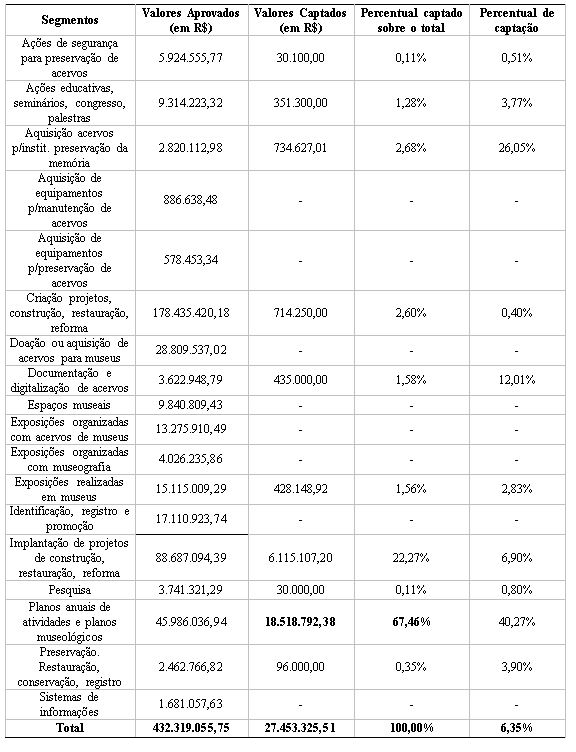 Inicialmente os museus brasileiros tinham a função de apresentar aspectos que descrevessem a história nacional e posteriormente, ganharam a função de expor coleções artísticas de mecenas (Vieira, 2017). Na LIC essa área é dividida em alguns segmentos culturais (Tabela 8), sendo que o segmento de Planos anuais de atividades e planos museológicos se destaca pelo volume de captação, com 67,46% do total captado, o que demonstra que a LIC contribui na manutenção de instituições dessa área.