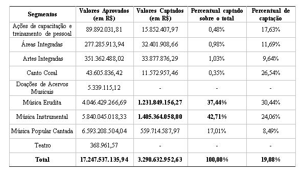 A área de Música é a segunda em termos de volume de captação, contando com 22,63% do total de recursos. Nessa área tiveram 15.700 projetos aprovados, dos quais 4.884 conseguiram captar recursos. Dos segmentos culturais da área (Tabela 9), se destacam as áreas de Música Instrumental e Música Erudita.
