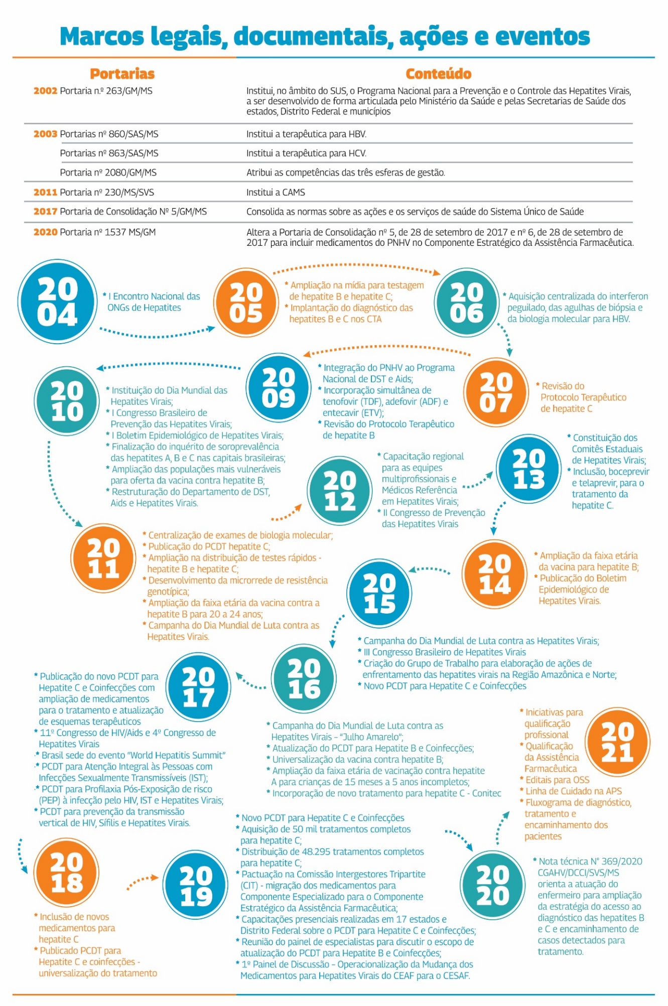 Nesses vinte anos do PNHV, o MS tem adotado estratégias relativas à prevenção, ao diagnóstico e ao tratamento das hepatites, o que configurou um direcionamento de uma política pública de saúde. Na Figura 1, é possível reconhecer os principais marcos históricos desse período.
