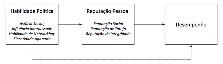 Além disso, é possível observar a reputação pessoal exercendo papel relevante na relação entre habilidade política e desempenho. Laird et al. (2013) concluíram que a habilidade política proporciona aos funcionários a capacidade de destacar seu desempenho de maneira favorável, resultando na formação de percepções positivas da reputação pessoal. Os resultados do estudo mostram que o desempenho no trabalho foi positivamente associado à reputação pessoal de funcionários politicamente qualificados, mas não a indivíduos com pouca habilidade política (Laird et al., 2013). Esses achados indicam a existência de função relevante da reputação pessoal na relação entre habilidade política e desempenho. Paralelamente, foram encontradas evidências de que a reputação exerce papel mediador entre habilidade política e desempenho. Liu et al. (2007) detectaram que a relação entre habilidade política e desempenho no trabalho foi totalmente mediada pela reputação pessoal.