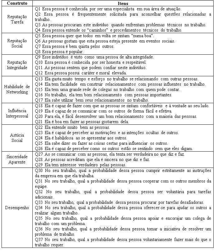 Habilidade Política. A avaliação da habilidade política foi realizada a partir de uma perspectiva multidimensional, buscando-se a avaliação das quatro dimensões do construto: Astúcia Social, Influência Interpessoal, Habilidade de Networking e Sinceridade Aparente. Foi utilizada a escala Political Skill Inventory (PSI) (Ferris et al., 2005), por já ter sido amplamente utilizada e validada em pesquisas empíricas sobre o tema (Chen, Jiang & Wu, 2021).