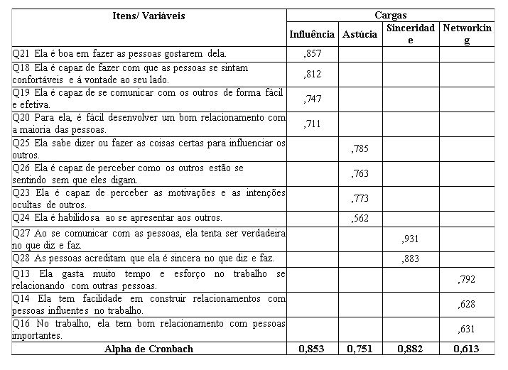 Os fatores criados mostram-se alinhados com os trabalhos de Ferris et al. (2005) e Ferris et al. (2007), de forma que o primeiro fator criado congrega variáveis que tratam sobre a capacidade de influência pessoal do agente, sendo o fator denominado Influência. O segundo fator traz variáveis afetas à astúcia social dos indivíduos, sendo denominada Astúcia. O terceiro fator é composto por variáveis afetas à sinceridade aparente do indivíduo, de forma que foi denominado Sinceridade. Por fim, o quarto e último fator agrega variáveis sobre a capacidade de construção de redes de contatos, sendo denominado Networking. A confiabilidade dos fatores foi avaliada a partir do Alpha de Cronbach. Observa-se que todos os demais apresentaram valores dentro dos parâmetros considerados adequados por Hair Jr. et al. (2010).