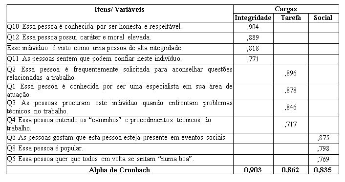 Os resultados das análises com o construto Reputação (Tabela 3) apresentaram coeficiente KMO e teste de Barlett adequados (0,834 e p < 0,00 respectivamente) e indicaram a criação de 3 fatores que explicam 81,64% da variância original das variáveis. O coeficiente Alpha de Cronbach apresentou valores adequados para os 3 fatores. Os resultados da análise fatorial com as variáveis do construto Reputação correspondem ao proposto por Zinko et al. (2016). Seguindo o proposto pelos autores, os fatores criados foram denominados de Integridade, Tarefa e Social.