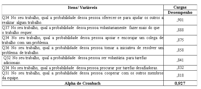Desempenho. A presente pesquisa trata ambiente de interação entre funcionários públicos e representantes de empresas reguladas/ grupos de interesse, de forma que se optou pela avaliação do desempenho individual a partir de uma perspectiva contextual. O desempenho contextual está associado a interações com outros indivíduos e comportamentos que demonstram autodisciplina, persistência e disposição para se esforçar no trabalho e envolve padrões comportamentais que sustentam o contexto psicológico e social no qual as atividades da tarefa são realizadas (Scotter, Motowidlo & Cross, 2000). Para avaliar o desempenho contextual foi utilizada a escala criada por Borman e Motowidlo (1993). Os itens foram avaliados em uma escala de 1 (nada provável) a 7 (extremamente provável).