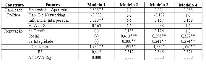 Os Modelos 3 e 4 testaram os fatores de Habilidade Política e Reputação de maneira conjunta, sendo que no Modelo 3 foram inseridas todas as variáveis. No Modelo 4 foram inseridas somente aquelas variáveis que apresentaram significância estatística em algum dos modelos anteriores. Somente os fatores Reputação Social e Reputação de Integridade mantiveram a associação positiva ao desempenho. Os fatores, Influência Interpessoal e Sinceridade Aparente (relacionados à Habilidade Política), inicialmente significativos (conforme Modelo 1), tornaram-se não-significativos com a inserção das dimensões relacionadas à reputação pessoal. Esses resultados indicam uma situação de mediação da Reputação sobre a relação entre Habilidade Política e Desempenho.