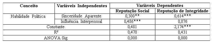 A partir da criação dos fatores não foram detectados casos faltantes, no entanto quatro observações foram eliminadas por se tratar de casos extremos. O diagnóstico de multicolinearidade foi feito por meio da correlação de Pearson e não evidenciou a presença de altas correlações entre os fatores. Os dados foram, então, submetidos à análise de regressão múltipla, adotando o Desempenho como variável dependente e os fatores afetos à Habilidade Política e à Reputação pessoal como variáveis independentes. Os resultados são apresentados na Tabela 5.