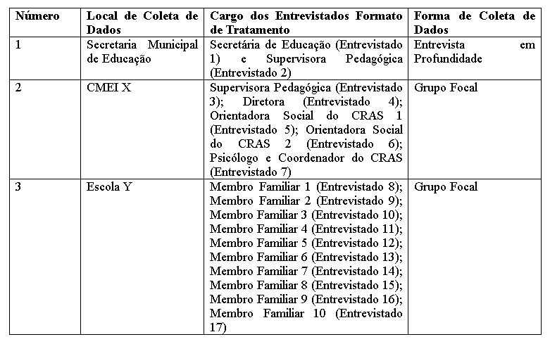Nessa perspectiva, esses indivíduos foram entrevistados na Secretaria Municipal de Educação, por meio de uma entrevista em profundidade com a Secretária de Educação (Entrevistada 1) e Supervisora Pedagógica (Entrevistada 2); no CMEI X, por meio de um grupo focal com a Supervisora Pedagógica (Entrevistada 3), Diretora (Entrevistada 4), Orientadora Social do CRAS 1 (Entrevistada 5), Orientadora Social do CRAS 2 (Entrevistada 6) e, Psicólogo e Coordenador do CRAS (Entrevistado 7) e; na Escola Y, por meio de um grupo focal com 10 membros familiares dos estudantes, que foram denominados (Entrevistado 8 à Entrevistado 17).