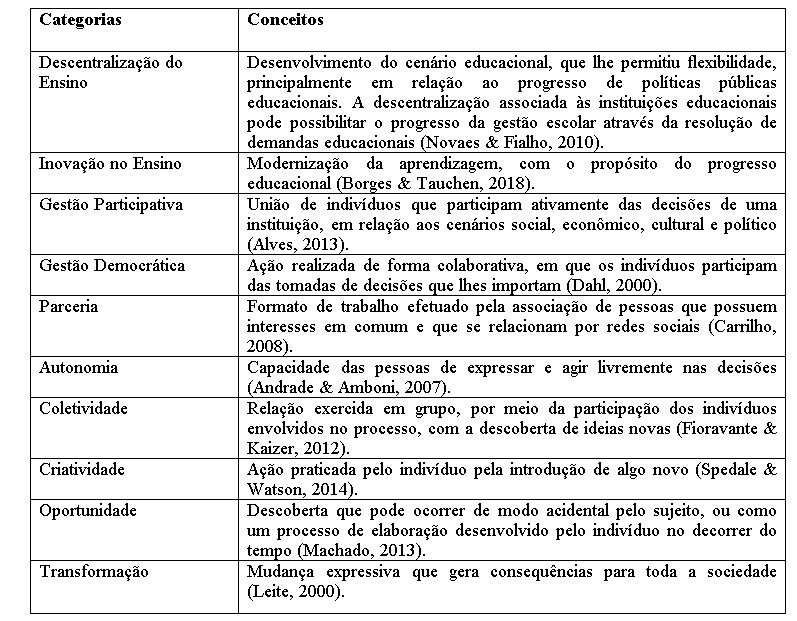 As categorias de análise foram elaboradas e expostas no referencial, que busca apresentar as relações existentes entre a gestão escolar e o PNE, na perspectiva da ação empreendedora. Foram criadas 10 categorias de análise, a partir dos estudos e abordagens associados à interpretação do conceito da Gestão Escolar, quais sejam: 1) Descentralização do Ensino; 2) Inovação no Ensino; 3) Gestão Participativa; 4) Gestão Democrática; 5) Parceria; 6) Autonomia; 7) Coletividade; 8) Criatividade; 9) Oportunidade;10) Transformação. Essas categorias de análise com seus respectivos conceitos serão apresentadas na Figura 2, a seguir.