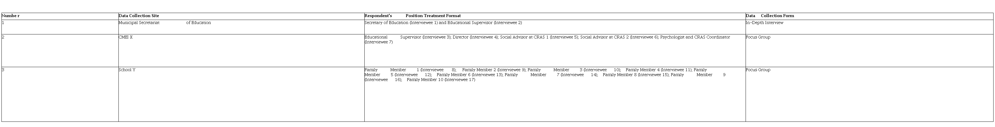 Within this perspective, these individuals were interviewed at the Municipal Secretariat of Education through an in-depth interview with the Secretary of Education (Interviewee 1) and the Educational Supervisor (Interviewee 2); at CMEI X, using a focus group with the Pedagogical Supervisor (Interviewee 3), Director (Interviewee 4), Social Advisor of CRAS 1 (Interviewee 5), Social Advisor of CRAS 2 (Interviewee 6) and, Psychologist and Coordinator of CRAS (Interviewee 7) and; at School Y, using a focus group with 10 students’ family members, who were named (Interviewee 8 to Interviewee 17).