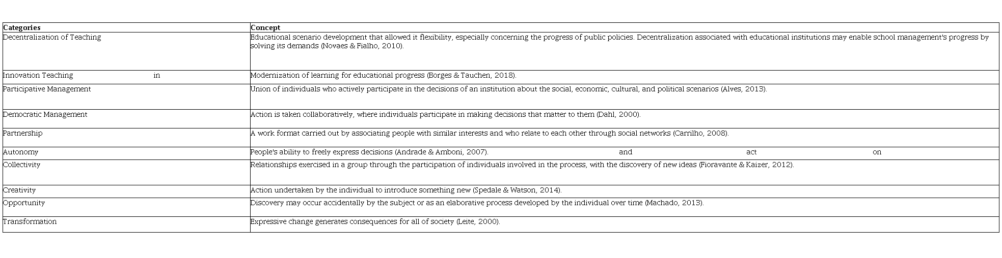 The categories of analysis were prepared and displayed in the referential, which seeks to present the existing relationships between school management and the PNE from the entrepreneurial action perspective. Ten categories of analysis were created from the studies and approaches associated with the interpretation of the concept of School Management, as follows: 1) Decentralization of Teaching; 2) Innovation in Teaching; 3) Participative Management; 4) Democratic Management; 5) Partnership; 6) Autonomy; 7) Collectivity; 8) Creativity; 9) Opportunity; 10) Transformation. These categories of analysis with their respective concepts will be presented in Figure 2 below.