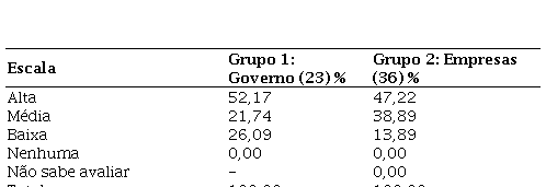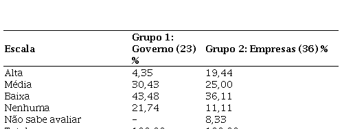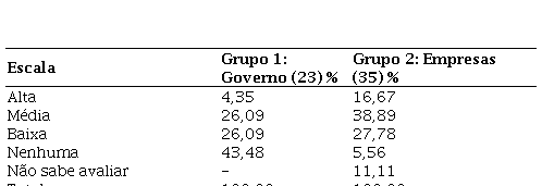 Complementarmente, a Tabela 3 reflete as frequências da interferência de interesses econômicos e traz resultados inesperados. No Grupo 1 (Governo), essa frequência atinge 4,35% e, no Grupo 2 (Empresas), 16,67%.