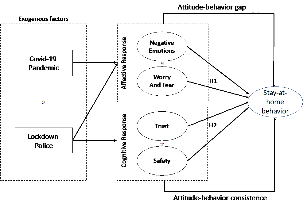 In our study, we argue that there is also a gap between the attitude and the behavior stay-at-home. As a voluntary, preventive health behavior, the Theory of Planned Behavior (TPB) may provide a useful framework for predicting compliance with social distancing (Gibson et al, 2021). We advocate that, during the pandemic, people behave in a right way obeying the law to stay-at-home with negative feelings, such as fear, anger, sadness, anxiety, depression, and so on. Thus, people may not be comfortable with the social distancing measures enacted by the government, but they comply with it anyway. Barbera and Ajzen (2020) suggest that people seem to be more motivated to comply with the perceived normative expectations and behaviors of important social referents only when PBC is relatively low.