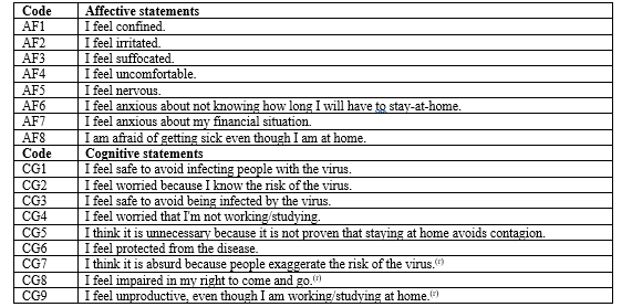 The attitudes were measured using a scale based on the study by Fhanér and Hane (1974). The items of the scale were adapted for the context of lockdown compliance during the COVID-19 pandemic. A Likert-type scale from 1 (strongly disagree) to 5 (strongly agree) was used. Before each item on the scale, the following prefix was added: “How do you feel about having to stay-at-home in social isolation during quarantine (lockdown) because of Covid-19?”. The Table 1 shows the items used to measure the attitudes regarding lockdown compliance. In SPSS, version 20, the items representing reverse ideas were coded as they are marked in the Table 1, where AF is affective and CG cognitive dimensions of the attitude.
