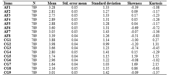 Next, an EFA was carried out with all scale items to verify the values of commonalities and factor loadings. Items with commonality and factorial loads below 0.5 were excluded, as suggested by Hair et al. (2009). Based on this criterion, items AF7, CG4, and CG9 were excluded. Subsequently, a new EFA was performed to verify the grouping of the items after the scale’s purification, and the KMO and Bartlett tests were conducted. Cronbach’s alpha was used to check the reliability of the data, in which 0.6 or greater values are considered adequate (Hair et al. 2009). The EFA results are presented in Table 3.