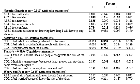 The second and the third factors are related to cognitive statements. The second factor (feel safe and protected) we named “Safety” for being related to the individual’s belief in the social isolation benefits, making them feel protected against the danger of coronavirus. The third factor is an attitude which consists of items that express doubtful thoughts about the reality of the pandemic and the risk associated with the virus; however, we discuss it from the perspective of trust, since the items that form this factor express reverse ideas, so this factor was named “Trust”, the trust on the efficacy of the social isolation measure.