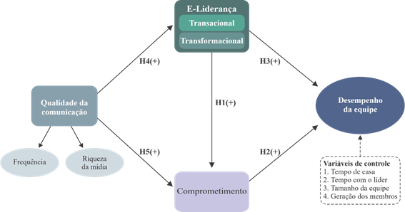 O comprometimento organizacional é essencial para que as equipes virtuais possam superar a distância física e trabalhar para alcançar os objetivos (Joshi, Lazarova, & Liao, 2009; Cordery, Soo, Kirkman, Rosen & Mathieu, 2009). Como a e-liderança pode exibir os mesmos estilos que a liderança tradicional, pois o diferencial é a forma como se manifesta (Avolio et al., 2014), adotaremos os estilos de liderança mais estudados pela literatura do campo: transacional e transformacional. Sendo assim, com base nos argumentos precedentes, constroem-se as seguintes hipóteses: