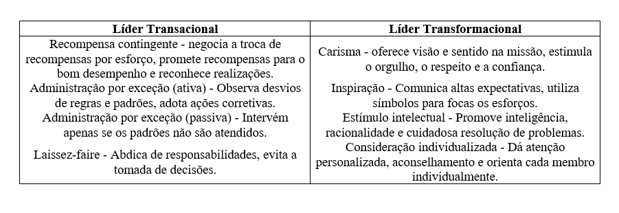 Os líderes transformacionais fornecem apoio socioemocional aos seguidores e aumentam o apelo emocional das atividades organizacionais, desenvolvendo assim o compromisso afetivo e o apego dos seus colaboradores à organização (Berkovich & Hassan, 2023). Bass (1990) apresenta as principais características dos líderes transacionais e transformacionais, conforme Quadro 1.