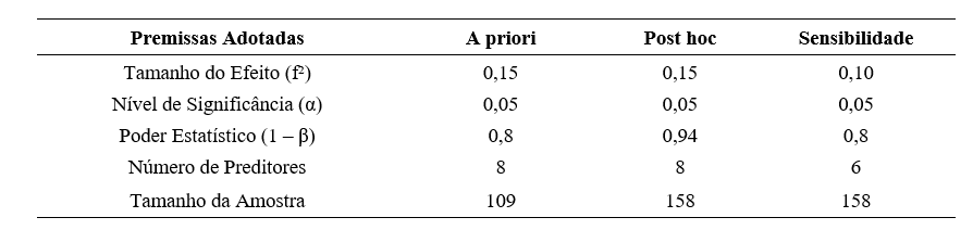 A amostra foi caracterizada como não probabilística, uma vez que o público-alvo deveria confirmar que executa suas atividades em teletrabalho. Para o cálculo da amostra utilizou-se o software G*Power de Erdfelder (Faul, Erdfelder, Lang & Buchner, 2007) na sua terceira versão (3.1.9.2) para análise do poder do teste, o que resultou em 98 amostras mínimas. Seguindo recomendações de Bentler & Chou (1987) e Hair, Black, Babin, Anderson & Tatham (2009), esta pesquisa buscou amostra mínima de 150 respondentes, tendo alcançado um total de 158 participantes. Conforme Tabela 1, a amostra final aumentou o poder estatístico (de 80% para 94%) e a sensibilidade (f² de 0,15 para 0,10) das análises estatísticas subsequentes.