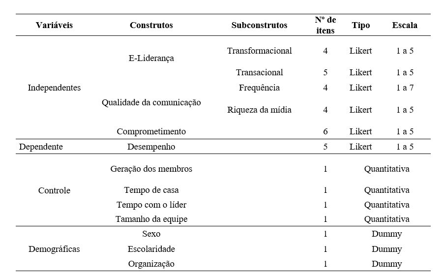 Segundo Hoch e Kozlowski (2014), o foco teórico da e-liderança é especificado no nível da equipe, portanto todas as medidas adotadas neste estudo foram especificadas nesse nível. Além disso, os itens de medição do questionário foram retirados de estudos anteriores que comprovaram sua boa qualidade psicométrica para avaliar as variáveis.