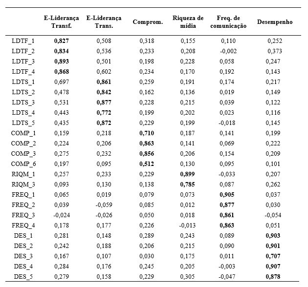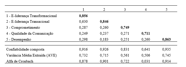 Os valores na diagonal, em destaque, são a raiz quadrada da AVE, como são maiores que as correlações entre os valores fora da diagonal, há validade discriminante no nível das variáveis latentes. Cabe destacar que a variável de segunda ordem Qualidade de Comunicação foi operacionalizada com abordagem em duas etapas, composta pelas variáveis de primeira ordem Frequência de Comunicação (Alfa de Cronbach 0,900) e Riqueza de Mídia (alfa de Cronbach 0,632). Essa é razão provável de o Alfa de Cronbach em segunda ordem ter apresentado um valor abaixo dos parâmetros esperados, o que, todavia, não afeta a validade do construto.
