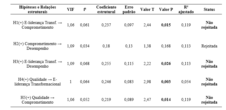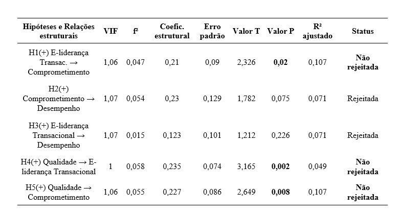 Para testar as hipóteses formuladas neste estudo foram gerados dois modelos distintos no SmartPLS, sendo um para cada estilo de E-liderança (Transacional e Transformacional). Na Tabela 6 apresentam-se os resultados das hipóteses considerando que a e-liderança se manifeste no estilo transformacional.