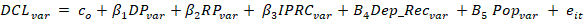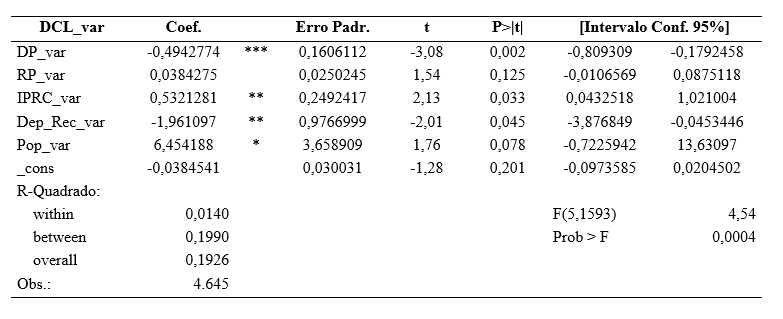 Em se considerando o modelo empírico estimado, a equação 3 apresenta sua especificação final, visando analisar o poder de explicação das variáveis explicativas que representam os determinantes de cash holdings, representadas pelos logaritmos das variações: das Despesas com Pessoal e Encargos (DP_var), dos Restos a Pagar (RP_var), da Imprecisão da Previsão das Receitas Correntes (IPRC_var), da Dependência de Receitas (Dep_Rec_var) e da População (Pop_var), na variável dependente de logaritmo da variação da Disponibilidade de Caixa Líquida – Recursos não vinculados (DCL_var).