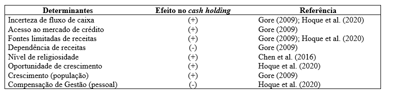 Assim, considerando os estudos anteriores sobre determinantes de cash holding em governos locais, são apresentados no Quadro 2 os determinantes já discutidos e quais seus respectivos efeitos sobre a cash holding.