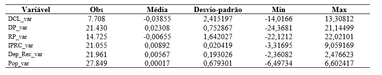 Primeiramente, com relação aos dados em consideração, apresenta-se na Tabela 1 suas estatísticas descritivas. É possível notar a variação no número de observações das variáveis, que justificam o uso do painel desbalanceado. Observa-se, ainda, que o fato das variáveis se apresentarem em função de suas variações de um ano em relação ao outro, as médias permanecem mais próximas entre si. Ademais, em conjunto com a aplicação dos logaritmos, foi possível controlar os potenciais efeitos das dispersões dos dados nos intervalos de confiança dos estimadores das variáveis explicativas, parametrizando a distribuição de probabilidade de suas funções de distribuição, além de permitir uma melhor interpretação dos coeficientes a serem estimados na regressão.