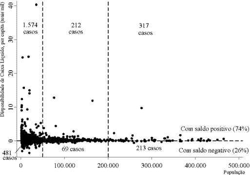 No ano de 2021, 494 municípios apresentaram saldo de caixa líquido (não vinculados) acima de R$ 10 milhões, valor expressivo. Ao se comparar o saldo de caixa líquido com o total de receitas correntes em 2021, a média foi de 8,5% para os municípios abaixo de 50.000 habitantes, 7,1% para os que estão entre 50 e 200.000 habitantes e uma média de 115% para os grandes municípios.