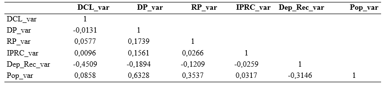 Como primeiro passo para discussão, apresenta-se a análise relativa à associação linear entre as variáveis do modelo a ser estimado. Neste sentido, a Tabela 2 apresenta o resultado do teste de correlação de Pearson entre as variáveis em questão. Nota-se que há uma correlação moderada entre a variação da Dependência de Receita (Dep_Rec_var) com a variação da Disponibilidade de Caixa Líquida – Recurso não vinculado (DCL_var), algo que já era previsto de acordo com a literatura anterior (Gore, 2009). Outra correlação moderada existente foi a da variação da População (Pop_var) com a variação de Despesas com Pessoal (DP_var), demonstrando que há uma associação positiva entre a variação do gasto com pessoal e a variação da população. De forma geral, nota-se que as variáveis não são altamente correlacionadas. Neste sentido, em termos estatísticos, isso indica que não há um possível efeito de multicolinearidade entre as variáveis explicativas, o que resguarda algumas das propriedades do modelo clássico de regressão, bem como da estimativa por métodos mais robustos (Beck & Katz, 1995).