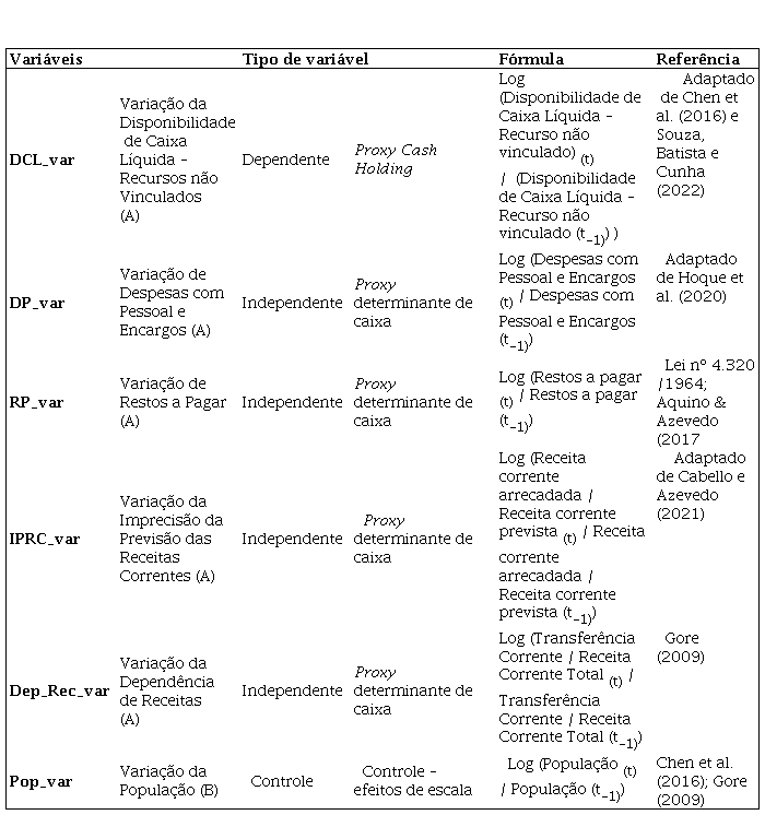 As variáveis explicativas, determinantes de cash holding, foram selecionadas considerando tanto a literatura prévia sobre o tema, quanto os regramentos fiscais brasileiros e disponibilidade. Foram utilizadas as variáveis “Despesas com Pessoal e Encargos”, “Restos a Pagar”, “Imprecisão da Previsão das Receitas Correntes”, “Dependência de Receitas” e “População”. Ademais, foram testadas as variáveis “Dívida Consolidada” e “Reserva de Contingência” no modelo, pois poderiam ser determinantes de cash holding. No entanto, elas não apresentavam bom ajuste no modelo e, portanto, foram descartadas. Entende-se, ainda, que a variável sobre variação da dívida consolidada não apresentou boa aderência ao modelo, pois os recursos vinculados podem estar sendo destinados para o seu pagamento. Já para as reservas de contingência, observou-se uma variação muito significativa nos dados, conforme também apontado por Souza, Azevedo e Crozatti (2021), optando por não as utilizar.