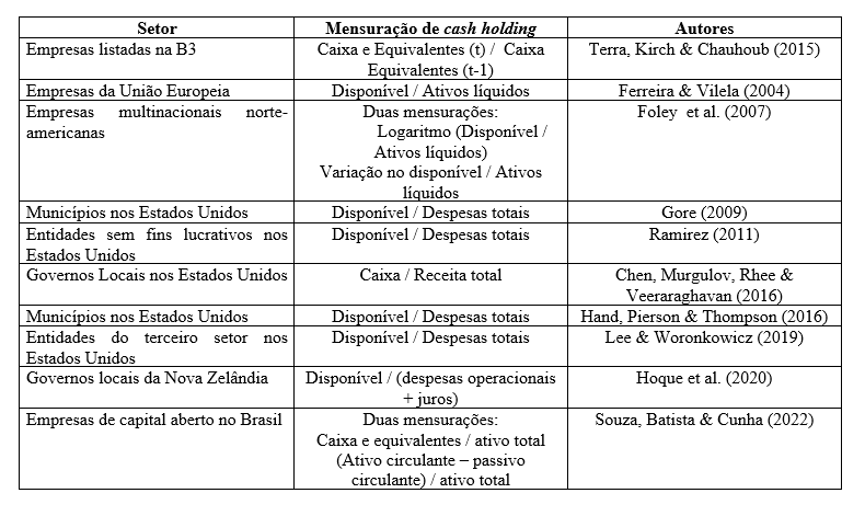 No âmbito das finanças públicas, a literatura prévia sobre determinantes de cash holding é predominantemente internacional, considerando aplicação em governos situados majoritariamente em países desenvolvidos (Gore, 2009; Chen, Murgulov, Rhee & Veeraghavan, 2016; Hand, Pierson & Thompson, 2016; Hoque, Bhuijan, Nomura & Zijl, 2020). No Brasil, não foram encontrados estudos que analisassem determinantes de cash holding na administração pública. No entanto, foram identificados alguns estudos que analisaram o nível de recursos internos e condição financeira de municípios e estados com objetivo de observar a capacidade dos governos ofertarem e manterem a continuidade dos bens e serviços à sociedade (Lira, Diniz & Lima, 2018; Gonçalves & Caldas, 2019).