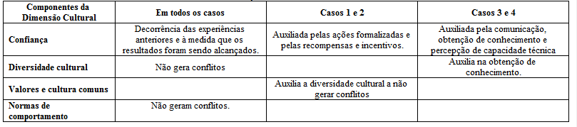 Nesta dimensão, analisou-se quatro componentes: confiança, diversidade cultural, normas de comportamento e valores e cultura comuns. Nos quatro casos, a confiança estava presente e foi sendo desenvolvida a partir das experiências anteriores e com os resultados obtidos. Também foi destacado a relevância da comunicação constante (casos 3 e 4) e dos encontros presenciais, além da transparência mesmo quando há resultados insatisfatórios. O tempo de parceria (caso 2) também foi destacado como importante para o desenvolvimento da confiança.