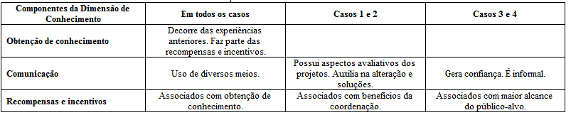 Nesta dimensão, analisou-se três componentes: obtenção de conhecimento, comunicação e recompensas e incentivos. A obtenção de conhecimento ocorre com as atividades e ações conjuntas, nos momentos que os gestores trocam experiências e aprendizados. Assim, a internalização dos conhecimentos acontece pelos funcionários e voluntários, sendo algumas vezes documentado e armazenado. Dessa forma, os gestores da OSC do caso 1 afirmam buscar ao máximo a retenção dos colaboradores. No caso 3, existe a tentativa de descrever os aprendizados em relatórios e fazer encontros internos para discussão acerca dos conhecimentos adquiridos. Porém, alguns conhecimentos não podem ou não conseguem ser repassados. Percebe-se isso quando o gestor da OSC do caso 2 afirma que alguns projetos dependem dos funcionários do parceiro para ocorrer.