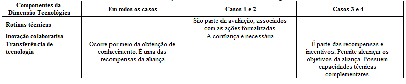 A tecnologia transferida entre as organizações são, primordialmente, seus conhecimentos. Ademais, todos os casos destacam essa transferência como o principal benefício percebido. O quadro 5 apresenta um resumo das informações encontradas na dimensão tecnológica.