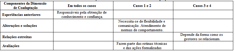 Uma vez apresentado o resultado da dimensão de coadaptação e seus quatro componentes (experiências anteriores, alterações e soluções, relações estreitas e avaliações), encerra-se aqui a apresentação dos resultados com a elaboração de cinco quadros (2 a 6) com resumos das informações coletadas. Passa-se então para a seção de discussão dos resultados, com comparação dos achados empíricos e teóricos. Para tanto, elaborou-se 3 figuras que destacam as similaridades entre todos os casos e entre os dois primeiros e os dois últimos casos.