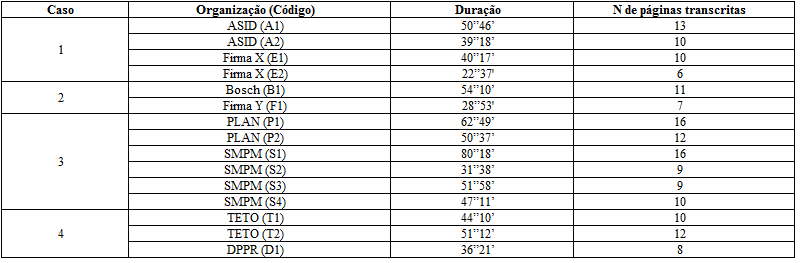 No caso 1, foram entrevistados um dos cofundadores, que também é diretor executivo da ASID, uma gerente de projetos da ASID, a gerente de RH e a analista responsável pela equipe de responsabilidade social corporativa da empresa X. No caso 2, foram entrevistados o gerente administrativo do Instituto Bosch e a gerente da unidade da empresa Y que trabalha diretamente com o Instituto em Curitiba. Já no caso 3, da Plan, foram entrevistadas a gerente da unidade de programas em Teresina e a gerente de gênero e incidência política. Da SMPM, foram entrevistadas a secretária municipal, a gerente de enfrentamento a violência contra a mulher, a gerente de articulação e a secretária executiva (subsecretária). Por fim, do caso 4, da TETO Brasil, foram entrevistados o ex gestor e a atual gestora da sede do Paraná e do NUFURB, foi entrevistada sua defensora pública responsável. O quadro 1 a seguir detalha as entrevistas realizadas, com informações acerca do caso estudado (casos 1 a 4), a organização estudada e código da pessoa entrevistada (coluna 2), duração da entrevista (em minutos) e número de páginas transcritas.