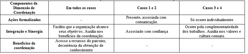 As alianças estudadas apontaram os seguintes benefícios da coordenação: o acesso aos conhecimentos e a utilização dos recursos do parceiro. Ademais, para os casos 3 e 4 cita-se: o alcance de mais pessoas, o aumento da visibilidade proporcionada pela aliança e o acesso das OSCs às comunidades. Também foram benefícios da coordenação para o caso 1: o acesso aos recursos financeiros e as vagas disponibilizadas pelo parceiro para inserir pessoas com deficiência no mercado de trabalho. O quadro 2 apresenta um resumo das informações encontradas na dimensão de coordenação.
