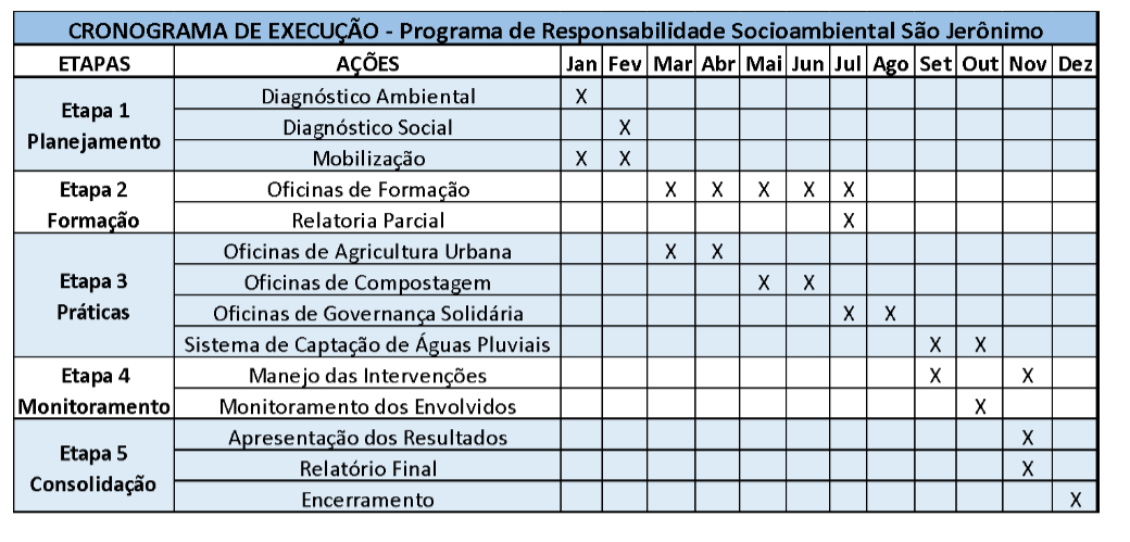 A etapa de mobilização e diagnóstico do Programa de Responsabilidade Socioambiental São Jerônimo foi desenvolvida nos meses de janeiro e fevereiro de 2017, sendo que a participação da equipe técnica consultora se estenderá até o prazo final desta primeira etapa do Programa, previsto para dezembro de 2017.