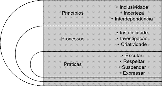 A partir da identificação da contribuição metodológica da dialogia e de todo o processo de gestão de projeto socioambiental, Frediani, Davel e Ventura (2021) propõem uma tecnologia de gestão de projetos socioambientais capaz de orientar a prática do gestor. O modelo proposto se baseia em três aspectos fundamentais, oriundos da teorização dialógica e perfeitamente aplicáveis à gestão: princípios, processos e práticas. Cada um desses elementos se desdobra em aspectos específicos, conforme Figura 1.