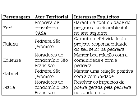 · identificar quem são os principais atores do território retratado, chamados de atores territoriais, sendo eles: (a) pedreira São Jerônimo, por meio de seus funcionários diretamente envolvidos; (b) moradores do condomínio São Francisco, e; (c) empresa de consultoria CASA, por meio de seu gestor.