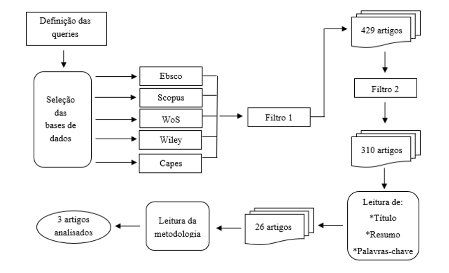 O processo originou-se a partir da definição de três estratégias de pesquisa aplicadas igualmente em todas as bases de dados com a intenção de atingir o escopo proposto. As queries de busca consistiram em: a) governance OR governança OR gobernancia; b) “setor público” OR “public sector” OR “sector público” OR “setor governamental” OR “government sector” OR “sector gubernamental” OR “administração pública” OR “public administration” OR “administracion publica”; e c) “measurement scale" OR “escala de medição” OR “escala de medición” OR "measure scale" OR “escala de medida” OR “validation” OR “validación” OR “validação” OR “scale” OR “escala” OR “medida”.
