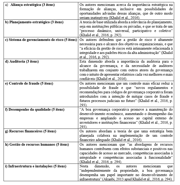 A escala utilizada por Khalid et al. (2016) teve por objetivo explorar o nível de boas práticas de governança no setor público da Malásia, utilizando-se de uma escala adaptada do Instituto de Integridade da Malásia (2012). A escala aplicada possui nove dimensões compreendendo: aliança estratégica; planejamento estratégico; auditoria; sistema de gerenciamento de risco; controle de fraude; desempenho de qualidade; recursos financeiros; gestão de recursos humanos; e infraestrutura e instalações.