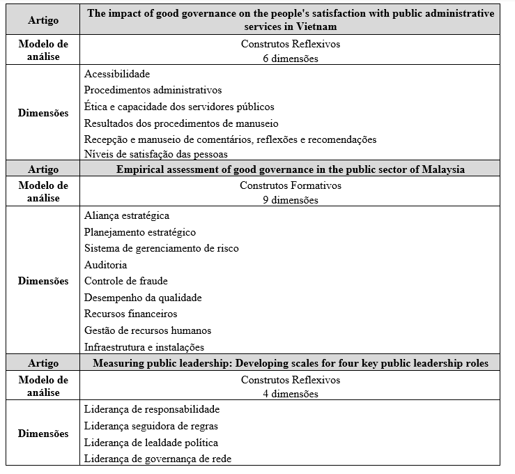 A pesquisa de Tummers e Knies (2016) apresentou uma intenção mais operacional ao se preocupar em desenvolver um instrumento de medição confiável e válido para funções de liderança no setor público. Numa abordagem diferente, os trabalhos de Chien e Thanh (2022) e de Khalid et al. (2016) convergiram quando apresentaram uma preocupação em compreender e analisar o nível de governança em nível nacional, inclusive ambos se utilizando de instrumento já criado para medir a governança nos referidos países Vietnã e Malásia, respectivamente. Se observa nestes trabalhos, a necessidade de supervisionamento de práticas de boa governança, em que se apresentou a preocupação dos próprios países em monitorar a satisfação com a governança da nação, elemento essencial para alcançar níveis desejados de desenvolvimento econômico, social e político segundo os autores.