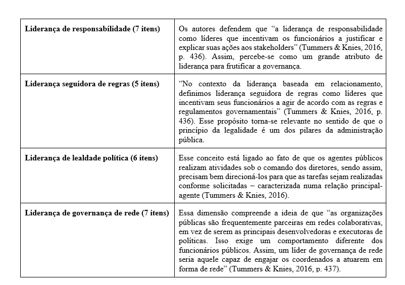 Quanto à parte teórica, os autores abordaram quatro visões de liderança, e, embora apenas um dos construtos mencione acerca especificamente sobre governança, de alguma forma, todos estão alinhados à boas práticas de liderança dentro da organização pública, convergindo para esse sistema necessário para o desenvolvimento sustentável das organizações. Como exemplo, a liderança baseada no relacionamento analisa o comportamento dos líderes em relação aos seus subordinados no apoio para fins de incentivar a prestação de contas junto aos interessados (Tummers & Knies, 2016) – ou seja, diretamente relacionado com a noção de accountability, um dos direitos estabelecidos aos cidadãos brasileiros pela Constituição Federal de 1988, segundo Oliveira e Pisa (2015). Da mesma forma, liderança baseada em regras, que trabalha o cumprimento das normas governamentais, encontrando alinhamento com o conceito da legalidade – uma das boas práticas da boa governança (Correio & Correio, 2019).