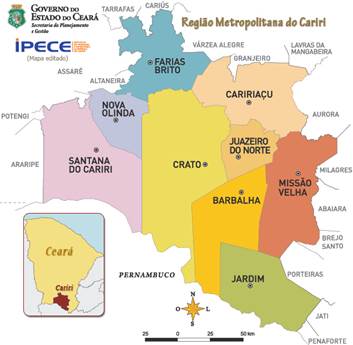 Refernte à Região Metropolitanda (RM) do Cariri possui uma área total de 5.456,01 Km2 e se constituiu como região metropolitana em virtude de ser a segunda região urbana mais expressiva do estado, dada com a conurbação formada pelos municípios de Crato, Juazeiro do Norte e Barbalha, denominada de CRAJUBAR.
