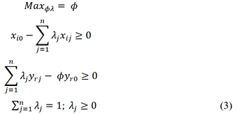 O CCR desenvolve uma superfície linear por partes não paramétrica envolvendo os dados. O modelo idealizado por Charnes, Cooper e Rhodes (1978) considera valida uma tecnologia com retornos constantes de escala, especificada por uma série de restrições que possibilitam a flexibilidade dos pesos atribuídos aos inputs e outputs. Assim, o modelo atribui o nível de eficiência de cada Unidade Tomadora de Decisão (DMU), pela otimização da razão entre a soma ponderada do nível de outputs e a soma ponderada dos inputs utilizados, cuja solução implica na obtenção dos valores de v1 e ur, que representam os pesos ou a importância relativa de cada insumo e produto. Ante o exposto, o CCR captura a combinação de insumos e produtos que obtém a melhor alternativa produtiva para a DMU avaliada. A eficiência da i-ésima DMU possui a seguinte forma: